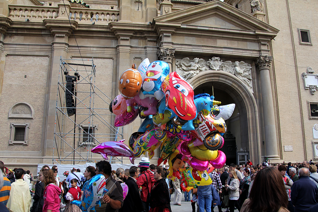 El Pilar tampoco se libraba, y mientras a la virgen la adornaban de vivas flores, a las puertas del templo se ofrecían delfines, Doraemons, Bob's, Rayos y unicornios, antes de intentar poner una vela, o de esperar para dar un beso a un mármol.